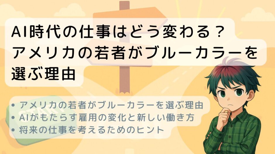 特にアメリカでは、AIの導入が進む中で、ホワイトカラー(オフィスで働く仕事)よりも、ブルーカラー(現場で体を動かす仕事)を選ぶ若者が増えているそうです。